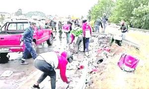 Conductores ayudan a recoger latas de cerveza que cayeron de camión