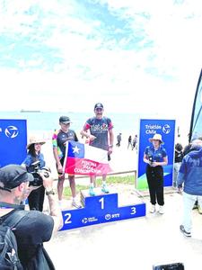 Triatleta levanta la bandera por una piscina para la natación local